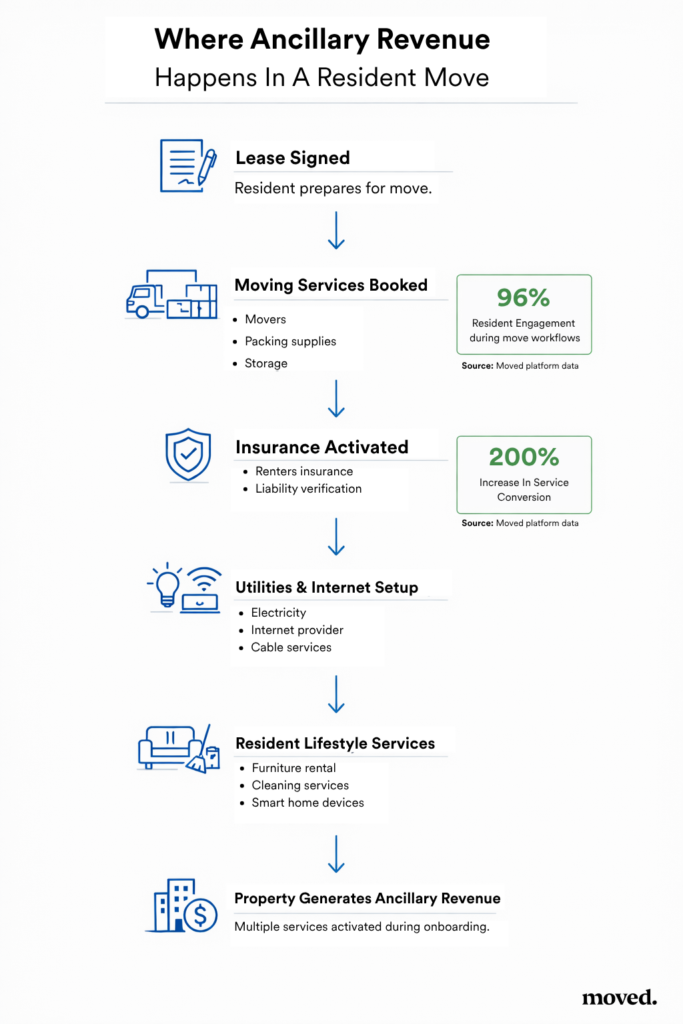 Move events, in particular, create a powerful opportunity. When residents prepare to move into a new apartment, they already need services such as movers, packing supplies, storage solutions, and insurance coverage. Property operators are increasingly exploring ancillary revenue in real estate to unlock additional income through services residents already need during a move.