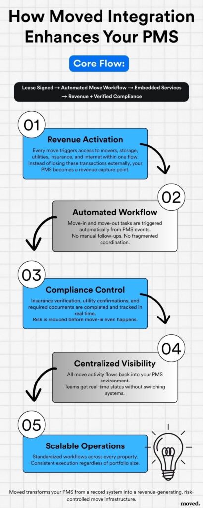 When move workflows are not integrated with the PMS, residents complete these decisions independently. They search external platforms, compare providers, and finalize transactions outside the property’s environment. The property has no visibility into these actions and no participation in the associated revenue.